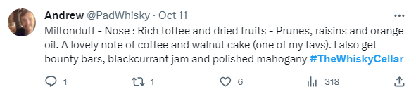 Finish: Lingering ginger spice, tropical fruit and dry icing sugar. Great dram to open the evening with!